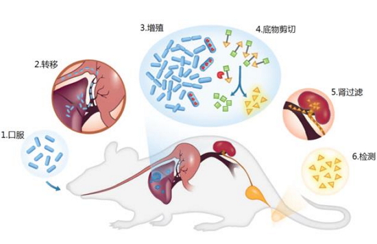 检测原理:转基因大肠杆菌EcN经小鼠口服后,会通过肝门静脉被吸收至肝脏,并在肝脏内进行增殖。之后给小鼠血液内注射酶切底物引入的底物被益生菌产生的酶剪切,生成萤光素,随尿液排除后即可进行检测。图片来源:研究论文