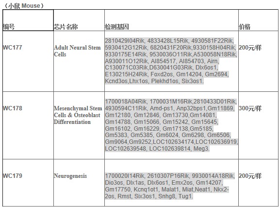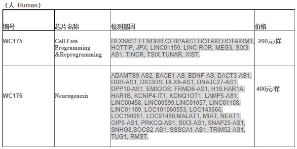 启因生物对细胞编码和重组、神经发生、神经干细胞、间充质干细胞和成骨细胞分化等相关的lncRNAs实行促销活动,优惠价格见下表。