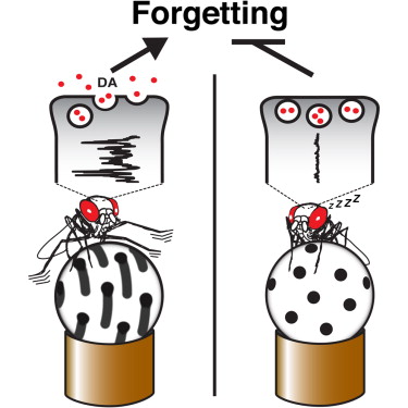 研究表明,采用促进睡眠的药物或是遗传刺激神经睡眠回路来增加睡眠,都可以减少多巴胺介导的信号活动,同时增进记忆保存。与之相反,促进唤醒可以刺激多巴胺信号,加速遗忘。这一信号活动并非保持不变,它与动物的唤醒水平直接相关。