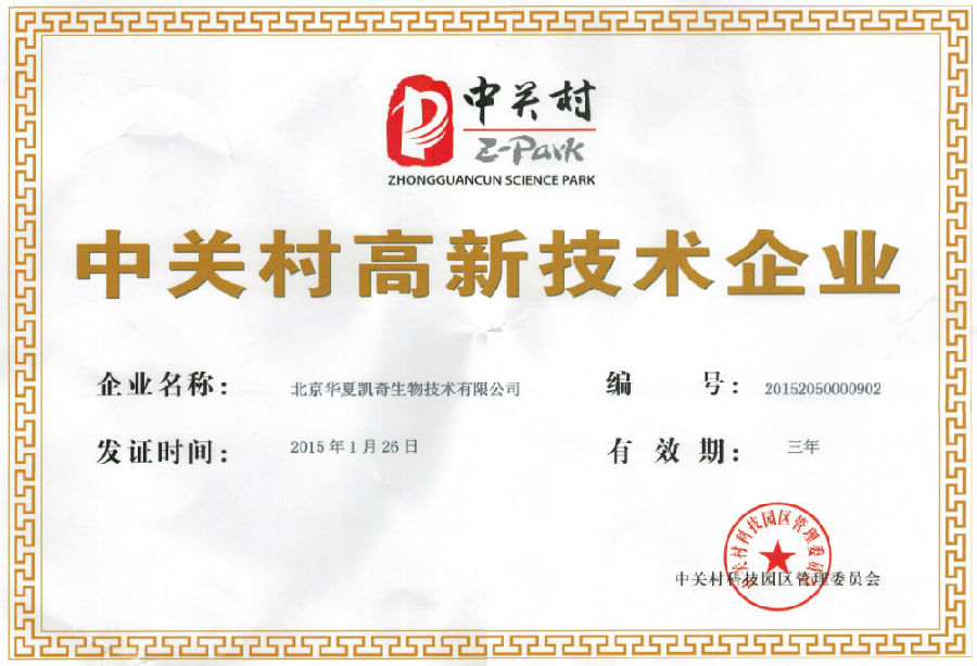 2015年1月26日,北京华夏凯奇生物技术有限公司荣获“中关村高新技术企业”称号。