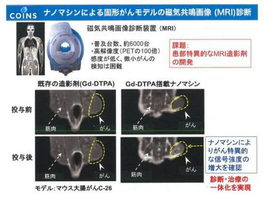 研究小组向移植了大肠癌细胞的实验鼠注射这种胶囊,发现胶囊集中到了癌细胞周围,利用磁共振成像拍摄时,获得了比平时更加清晰的肿瘤形状。注射24小时后,从体外瞄准病灶处照射较弱的热中子射线,钆就释放出伽马射线,杀死了附近的癌细胞,最终确认能够遏制肿瘤增殖。