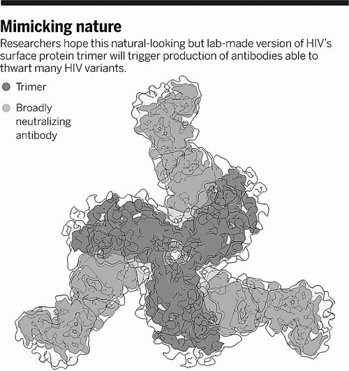 另外两篇文章的成果显示,另一种艾滋病病毒蛋白复合体或许能“诱骗”已经在制造bNAb的B细胞产生更多潜在版本的抗体。这种正在考虑的粒子是密布于艾滋病病毒表面的3种gp120蛋白的复合物。在其“天然的”形式下研究这种三聚物是一项巨大挑战,因为它在没有附着在病毒粒子上时便会分开。不过,来自纽约威尔康乃尔医学院的John Moore已经知晓了如何使类似天然形式的三聚物保持稳定。现在,Moore、同样来自威尔康乃尔医学院的Rogier Sanders和一个庞大的合作者团队将这些天然三聚物注射进兔子和猴子体内。正如他们在《科学》杂志上所报告的,由天然三聚物引发的抗体是有效的,而且至少在试管中消灭了艾滋病病毒的一个顽强分离物。不过,这项测试在其他实验室制造的三聚物中失败了。