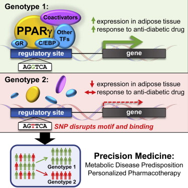 Lazar和研究小组证实,PPAR-γ开关中的SNPs提供了一种疾病风险相关机制。例如,其中一个SNP与高密度脂蛋白(HDL,“好”胆固醇)和甘油三酯等血脂,以及腰臀比例有关。这一系列的表现称作为“代谢综合征”, Soccio指出“惊人的一点是,单个DNA碱基改变就可以决定PPAR-γ是否结合脂肪组织中的一个调控位点,这有可能会改变个体的代谢综合征风险。”
