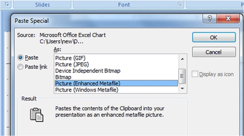 3. 我们在Excel中复制单个图表,回到powerpoint,但是不要直接粘贴,而是用pastespecial, 然后选picture(enhanced metafile) 或者picture(windows metafile)