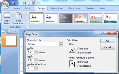 1. 首先要决定图版的大小,这需要综合考虑每个图表多大能让读者看得清楚,以及期刊对图版的尺寸的要求。在我们的例子中,我们希望每个图表是3英寸宽,2英寸高,左右排列,这样最终的图版我们可以设成6.4*2.2 inch.新建一个powerpoint文件,layout设成空白,在Design/Pagesetup处设置slide size为6.4*2.2,方向为landscape。