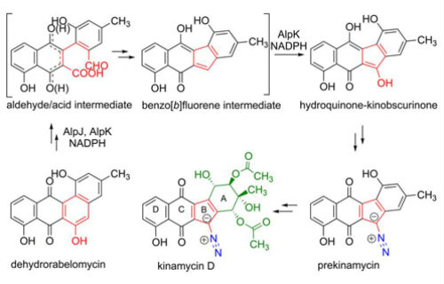 杨克迁课题组首先阐明了kinamycin的B环缩环机制。体内的遗传学实验使研究人员分离到香豆素类和三聚化的苯并芴类化合物,有力地证明了B环氧化开环后醛酸中间体的存在,并且促使研究人员首次提出缩环过程经历苯并芴中间体。体外酶学实验确认了氧化酶AlpJ与AlpK连续反应催化蒽醌向苯并芴酮结构转化。另外生物信息学分析发现氧化酶AlpJ与AlpK的同源蛋白编码基因在lomaiviticin和fluostatin基因簇内也保守排布,进而得出推论,它们负责相应化合物的B环缩环反应。