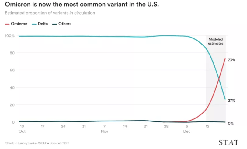 2021年12月20日,联邦卫生官员表示,Omicron已经领先于其他变种,现在是美国冠状病毒的主要版本,占上周新感染病例的73%。