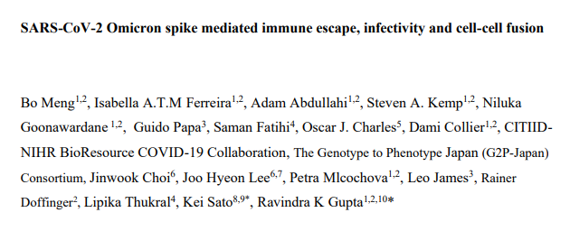 近日,英国剑桥大学的研究人员在预印平台发表了一篇题为" SARS-CoV-2 Omicron spike mediated immune escape,infectivity and cell-cell fusion "的研究论文。