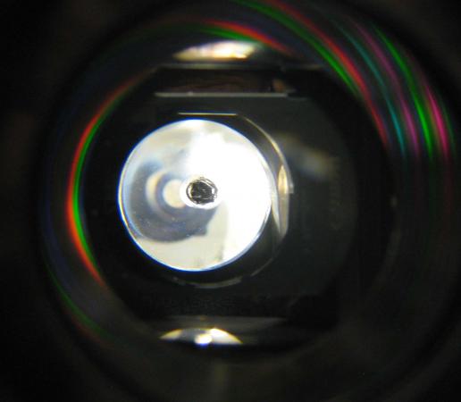 过了几天学生又来找我, 说问题照旧. 又去搞了一下, 却没搞好. 仔细看显微镜的图象好象光路中有个模糊的阴影. 再过几天,还是不知哪里坏了. 好在长周末,学生回家了,有时间把显微镜从仪器里拆下来,从后面往光路里一看, 哈! 果然镜子上有牛屎一砣!