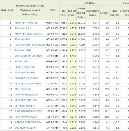 汤森路透2011年SCI影响因子和JCR将在2011年6月28日公布。本博客将在第一时间发布,预祝自己和大家好运! 大家期待许久的2011(2010年)影响因子和JCR已经于几小时前公布。 贴上心理学SCI的IF前20名。 大家如果需要查询期刊的2010年IF,