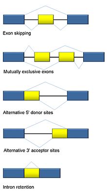 什么是可变剪接呢?看看上面这个图(来自https://en.wikipedia.org/wiki/Alternative_splicing),以最容易理解的内含子保留为例。一个内含子,有时候切掉,有时候不切掉,就形成了两种信使RNA。没切掉的那个,凭什么说它是有功能的呢?我可以认为它是剪接机器失灵,产生了废物。在很多人眼里,生物体是非常精密的仪器,不相信生物体会产生那么多废物。但如果你经常看是DNA修复、错误RNA的降解等方面的文献,注意到了生物体不灵光一面,就会觉得可变剪接产物是剪接废物也不是不可能。