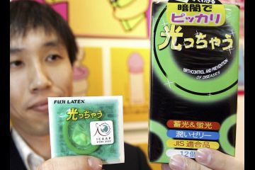 Japanese condom maker Fuji Latex employee Toru Katsumata displays a florescent-colored condom as part of Japan's Condom Association efforts to educate people about sexually transmitted diseases (STDs). Scientists have warned that a new strain of the STD gonorrhea has become resistant to antibiotics.