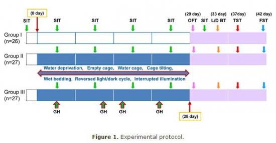 CMS procedures were performed on Group II and Group III animals for 4-weeks. The sucrose intake test (SIT) was performed at baseline, 3, 10, 17, and 24 days after CMS. The open field test (OFT) was performed at day 29. The light/dark box test (L/D BT) was performed at day 33. The tail suspension test (TST) was performed at day 37. The forced swimming test (FST) was performed at day 42. GH: Grouped housing (aggressive behavior by physical contact between two isolated mice).