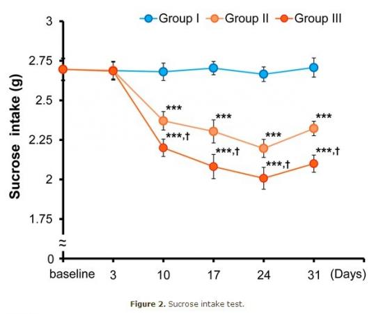 Sucrose intake test was performed at baseline, 3 days, 10 days, 17 days, and 24 days after the start of CMS as shown in Fig. 1. The intake of 1% sucrose solution in Group II and Group III mice was significantly lower than in Group I mice at 10, 17 and 24 days after the start of CMS. Values represent the mean ± SEM (n = 26 for Group I, n = 27 for Group II, n = 27 for Group III). ***p<0.001 as compared to Group I. +p<0.05 as compared to Group II.