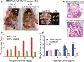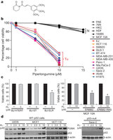 Abstract :Malignant transformation, driven by gain-of-function mutations in oncogenes and loss-of-function mutations in tumour suppressor genes, results in cell deregulation that is frequently associated with enhanced cellular stress (for example, oxidative, replicative, metabolic and proteotoxic stress, and DNA damage). Adaptation to this stress phenotype is required for cancer cells to survive, and consequently cancer cells may become dependent upon non-oncogenes that do not ordinarily perform such a vital function in normal cells. Thus, targeting these non-oncogene dependencies in the context of a transformed genotype may result in a synthetic lethal interaction and the selective death of cancer cells. Here we used a cell-based small-molecule screening and quantitative proteomics approach that resulted in the unbiased identification of a small molecule that selectively kills cancer cells but not normal cells. Piperlongumine increases the level of reactive oxygen species (ROS) and apoptotic cell death in both cancer cells and normal cells engineered to have a cancer genotype, irrespective of p53 status, but it has little effect on either rapidly or slowly dividing primary normal cells. Significant antitumour effects are observed in piperlongumine-treated mouse xenograft tumour models, with no apparent toxicity in normal mice. Moreover, piperlongumine potently inhibits the growth of spontaneously formed malignant breast tumours and their associated metastases in mice. Our results demonstrate the ability of a small molecule to induce apoptosis selectively in cells that have a cancer genotype, by targeting a non-oncogene co-dependency acquired through the expression of the cancer genotype in response to transformation-induced oxidative stress.