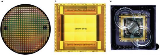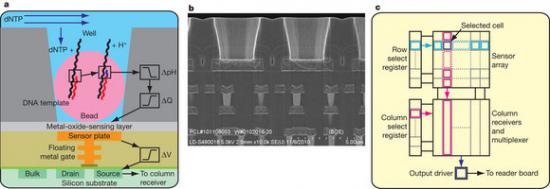 更便宜、更小巧的DNA测序设备的研制受到若干因素的限制,其中包括对成像技术的需求。一项新的DNA测序技术不需要用光学方式读取数据,而是通过直接感应由模板引导的DNA合成所产生的氢离子来获取序列数据。该技术提供了一个在大规模并行半导体感应设备上或离子芯片上进行低成本、规模化测序的途径。相关反应都是用天然核苷酸进行的,各个离子敏感性芯片都是一次性的,价格都不高。该系统已用于对三个细菌基因组和一个人基因组进行测序,其中的人基因组是因发现“摩尔定律”而知名的戈登•摩尔的基因组。
