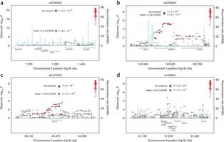Figure 2: Regional plots of four of the associated SNPs at 5p15 (a), 3q23 (b), 5p12 (c) and 6p21 (d).