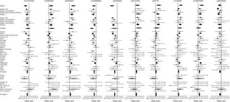 Figure 1: Forest plots for the ten SNPs genotyped in stages 1–4.