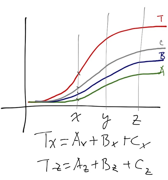 做多重PCR的时候,整个反应体系的扩增可以用图中的红线表示。而红线所代表的是每个特定模板(不同颜色曲线)扩增产物的总合。所以,即使是到了反应的终端(Z,end point)红线所代表的任然是不同产物的总合。