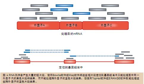 要将RNA的逆转录片段cDNA重新定位到基因组当中需要更加复杂的专业化算法。要将不同外显子经过剪切拼接之后生成的RNA短片段重新定位到基因组中和将一个外显子生成的RNA短片段重新定位到基因组中是完全不一样的(图14)。