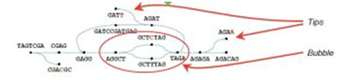 一个聪明的办法,却没解决所有的难题。因为基因组中含有大量的重复序列(repeats),多态性变异(Polymorphism),测序错误(Sequencing error),一条序列存在很多可能的路(图论),或者回环等。见下图。
