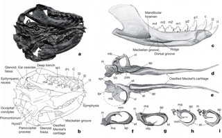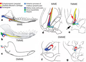 爬行动物的下颌由几块不同的骨头组成。然而,在哺乳动物中,它只由一块骨头组成,即承担牙齿的齿骨,因为其余的骨头大都变成了穿过中耳传输声音的小骨。这种转变是演化变化的一个典型事例,但关于这种转变过程正在进行当中的直接化石证据却一直难以找到。
