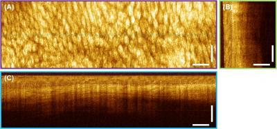 This is a 3-D OCT volumetric data set from an excised human colon specimen. (A) En face view showing regular organization of normal colon. (B and C) Cross-sectional views along two different directions showing sub-surface features. Two cross-sections are shown as examples, however multiple cross-sectional views can be extracted from the 3-D OCT data. Scale bar: 500um. (Credit: Massachusetts Institute of Technology)