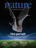 本期封面是一只飞翔的普通吸血蝙蝠(Desmodus rotundus),拍摄地在墨西哥。这些吸血蝙蝠具有特殊的本领,能检测红外辐射作为定位热血猎物身体的手段。除吸血蝙蝠外,这种“第六感”只存在其它 3类脊椎动物,它们是 “远亲关系”的蛇—蝮蛇(pit vipers)、蟒蛇(pythons)和王蛇(boas)。对这3类蛇来说,红外传感器都是一个被称为“颊窝器”的面部结构。在蛇类中,一个非热敏性的 离子通道(脊椎动物的TRPA1)是它们的红外探测器。正如本期Nature报告的那样,吸血蝙蝠探索红外线的分子机制稍有不同。在该机制下,RNA剪接 导致产生TRPV1热敏通道的变体,它能适应较低的温度。将这一通道的基因序列与其他动物的做比对,在分子水平上支持这一假设:这些蝙蝠在演化上是与马、 狗、母牛、鼹鼠和海豚(属于“劳亚兽总目”)属于一类的,而不是解剖学提出的那样——与人类、猴子和啮齿类(属于“灵长总目”)属于一类。