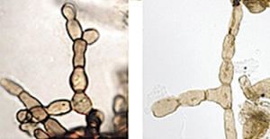 Rhizoctonia solani (左)类似于2.5亿年前的 Reduviasporonites