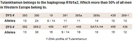 iGENEA公司表示现代埃及人属于haplogroup R1b1a2基因谱群的可能性不到1%。DNA族谱中心负责人罗曼-斯库尔兹说:“他属于欧洲的一个基因谱群。这显然是一个非常有趣的发现,说明埃及人的DNA可能属于很多谱群。”研究发现有大约70%的西班牙男性和60%的法国男性与图坦卡蒙属于同一谱群。3000多年前,这位法老王统治埃及。
