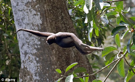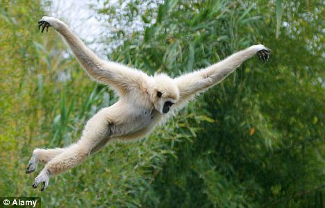 Study co-author Dr James Usherwood, of the Royal Veterinary College in Hatfield, told the BBC: 'Gibbons appear to hit a size 'sweet-spot', where they are big enough (helped by long arms and legs) to power jumps directly with muscle, but small enough to survive crashing about through trees.