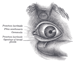 半月皱襞是在眼部结膜内侧,相当于低等动物的第三眼睑,是进化过程中的退化痕迹,组织结构与球结膜近似,血管丰富。在很多鸟类、爬行动物中都有这样的特征。