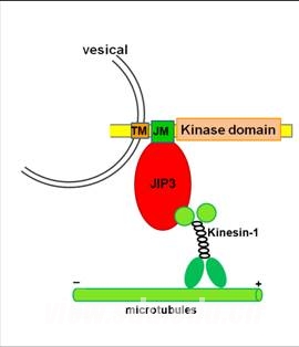 在这篇文章中,研究人员证实JNK相互作用蛋白3(JIP3)可通过与TrkB受体的近膜区直接结合,将TrkB受体连接到马达蛋白kinesin-1的轻链上,从而介导了TrkB的顺轴突转运,但不影响TrkB在树突中的转运。进一步的研究发现JIP3介导的TrkB顺轴突转运可以调节BDNF诱导的Erk激活以及轴突中丝状伪足的形成。这些发现有助于深入认识TrkB受体顺轴突转运的分子细胞学机制及其对BDNF生物学作用的调节。