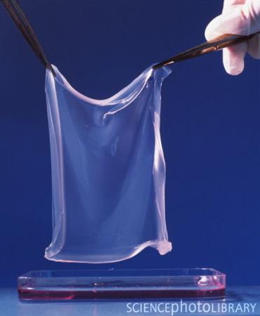美国约翰霍普金斯大学医学院的科学家研制出的新材料PEG-HA由人工合成的聚合物聚乙二醇(PEG)和天然的生物材料透明质酸(HA)制成。聚乙二醇是一种被用作外科胶的人造分子,并不会引起严重的免疫反应。透明质酸是出现在年轻人皮肤上的一种天然成分,能让年轻人的皮肤保持弹性。实验室测试表明,这种新的生物合成材料不会像纯粹的生物材料一样分解,也不会像某些人造材料一样出现排斥反应。