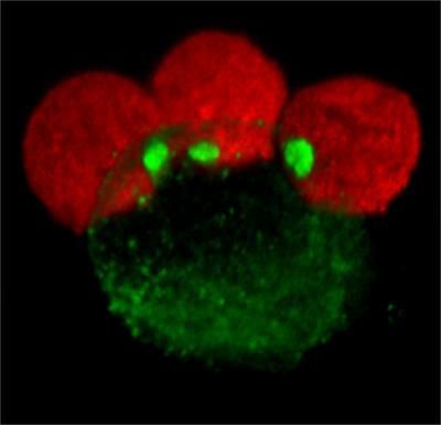 图为一个已被艾滋病病毒感染的供体细胞(绿色),正在感染正常细胞(红色)。