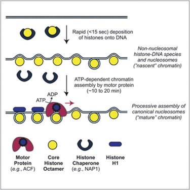 尽管这种前核小体在显微镜下看起来与核小体类似,但是,生物化学测试表明,它们其实是DNA和核小体之间的中间物质。一种蛋白使用能量分子腺嘌呤核苷三磷酸(ATP)将这些前核小体变成了核小体。