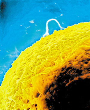 在与卵膜上的糖类结合后,其中一个精子将钻进卵子。