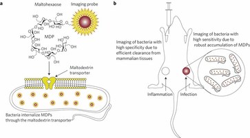 在世界范围内,细菌是导致多种疾病和部分死亡的重要原因。成像细菌感染过程的一个主要挑战是如何开发出能快速地、选择性地进入细菌的造影剂。Niren Murthy和同事实现了这一目标,他们用化学方法将一种荧光侧基团链接到一种在许多细菌的新陈代谢中发挥重要作用的特别糖类上,这种侧基团是能产生对比成像的分子的一部分。他们发现,大肠杆菌和其他细菌能迅速吸纳这些代谢成像探针,与过去的造影剂相比,新造影剂能以100倍清晰度敏感成像细菌感染过程。