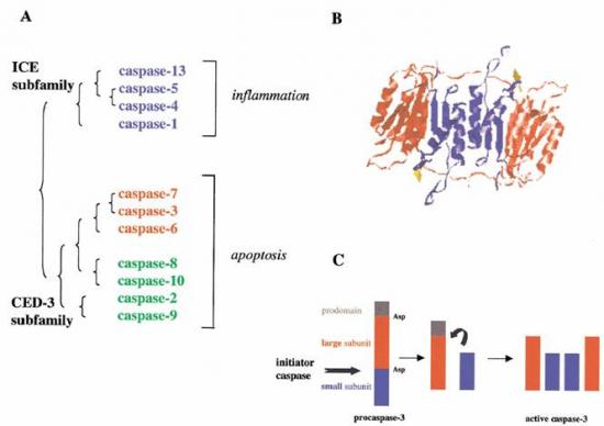 ICE家族成员 A:3类caspase:蓝色参与炎症反应,红色为执行者,绿色为启动者;B:caspase-3的结构模型;C:caspase-3的活化过程 引自Katja C. Zimmermann等2001(图)