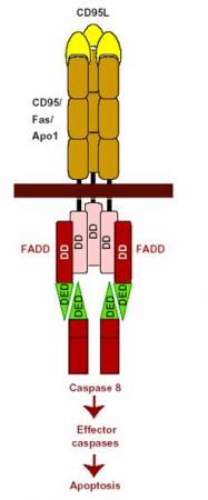 Fas具有三个富含半胱氨酸的胞外区和一个称为死亡结构域(Death domain,DD,图15-8)的胞内区。Fas的配体FasL(Fas ligand)与Fas结合后,Fas三聚化使胞内的DD区构象改变,然后与接头蛋白FADD(Fasassociated death domain)的DD区结合,而后FADD的N端DED区(death effector domain)就能与Caspase-8(或-10)前体蛋白结合,形成DISC (death-inducing signaling complex )[6] ,引起caspase-8、10通过自身剪激活,它们启动caspase的级联反应,使caspase-3、-6、-7激活,这几种Caspase可降解胞内结构蛋白和功能蛋白,最终导致细胞凋亡。
