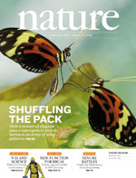 见于南美各地森林中的有毒蝴蝶“狐眼袖蝶”能够模仿另一科的有毒蝴蝶“Melinaea sp.”中几个物种的翅膀模式,以便更有效地威慑捕食者。“Müllerian拟态”的这个例子受一个经典的“超级基因”控制,它实际上是通常作为一个整体遗传的紧密基因簇。“狐眼袖蝶”尤其擅长拟态,能够模仿多达7个不同翅膀模式。对“狐眼袖蝶”不同翅膀模式形态所做的一项研究显示,在一个超级基因P位点上发生的不同基因组重排,使得在其他密切相关的物种中本可以自由重组的位点之间的基因联系更为紧密。这样所产生的超级基因起一个简单开关的作用,这个开关一旦闭合,便能够在一系列复杂的适应性表现型中选择这种蝴蝶应该表现出其中的哪一个。本期封面所示为来自法属圭亚那的“狐眼袖蝶”(上)和Melinaea mneme(下)。