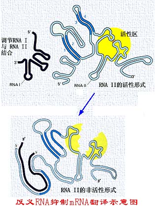 图中上侧蓝色的长链RNA Ⅱ代表呈活性状态的mRNA ,在其黄色的活性区域,RNA Ⅱ长链的部分链段结合在一起。下侧黑色的RNA Ⅰ代表反义RNA, 当RNA Ⅰ与RNA Ⅱ 结合(图中右侧部分),RNA Ⅱ 中的黄色区域中曾结合在一起的部分RNA链段分开,RNA Ⅱ 呈失活状态,关闭了RNA Ⅱ 的转录,即关闭了基因的表达。
