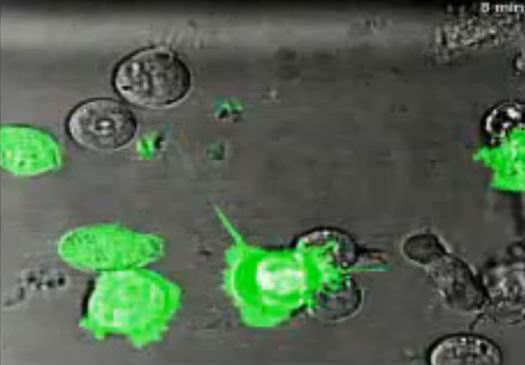 弗伦奇的研究小组制作的视频显示,在攻击病毒细胞之前,自然杀伤细胞内部的酶颗粒都集中在一起。细胞打开出口之后,这些酶颗粒便一涌而出,对病毒细胞发起攻击。自然杀伤细胞还使用薄膜纳米管(membrane nanotubes)将病毒细胞拖入自己体内。