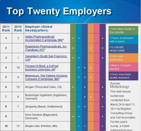 The 2011 results brought a new, first-time #1 employer: Vertex Pharmaceuticals Incorporated (#3 in 2010). In fact, three of the highest-ranking companies are new to the top 20 list (see Top 20 Employers chart below for complete company listing). These shifts aren't surprising, because "It's been an interesting time in the industry," observesAlan Smith, Genzyme Corporation's chief scientific officer before its acquisition by Sanofi. "For us, the past year has been a period of upheaval, but we've regularly scored well in this survey," he notes (Genzyme is #13 this year, #8 in 2010). Now chief science advisor for Sanofi Global Research and Development, he says, "As part of Sanofi, we'll take the approach we've used at Genzyme and apply it more generally."