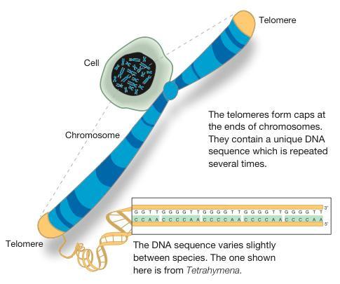 端粒(tolemere)是染色体末端的DNA重复序列。端粒是染色体末端的一种特殊结构,在正常人体细胞中,可随着细胞分裂而逐渐缩短。把端粒当作一件绒线衫袖口脱落的线段,绒线衫像是结构严密的DNA。排在线上的DNA决定人体性状,它们决定人头发的直与曲,眼睛的蓝与黑,人的高与矮等等,甚至性格的暴躁和温和。