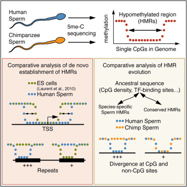 在这篇文章中,研究人员比对了人类精子,黑猩猩精子,以及人类胚胎干细胞的胞嘧啶甲基化变化,分析了这些甲基化发生的区域,从中发现虽然在胚胎干细胞和精子中,大部分启动子都逃避了甲基化,但是对应的低甲基化区域表现出了潜在的结构差异。比对人类和黑猩猩的甲基化情况,研究人员发现了一群差异甲基化启动子亚群,以及逆转录转座子亚群中的显著差异甲基化,这说明基因组序列中存在明显的这种进化影响。