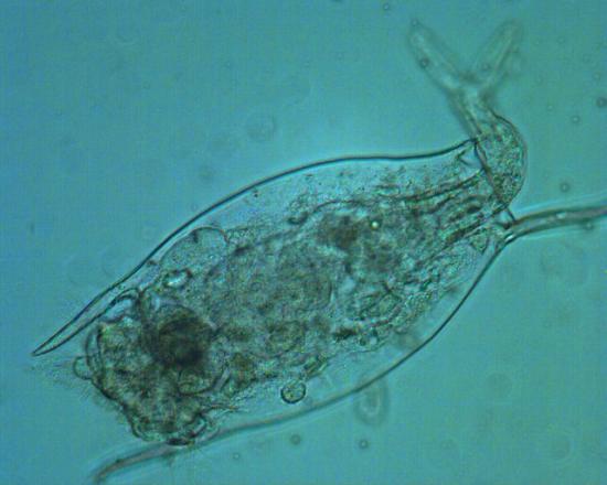 裂足轮虫。一种浮游生物,前端有纤毛,形似转轮而得名。