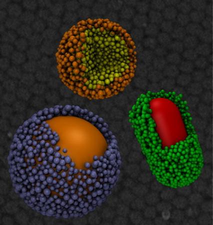 图片说明:背景为单分散CdSe超级纳米粒子的扫描电子显微镜图;彩色为超级纳米粒子的理论模拟图。