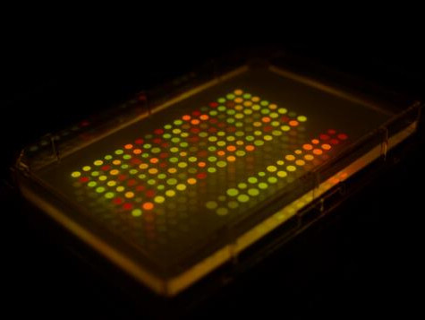 他们利用7个大肠杆菌菌株群,每个都加入了能表达出不同颜色荧光蛋白的基因。当基因打开后细菌就会发出不同颜色的光,如红绿蓝,人眼可以清晰识别出这些光。研究人员随后利用颜色组合信息。7种颜色有49种组合,可用于编码26个字母和23个字母数字符号如@和$。