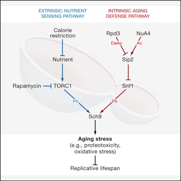 研究人员还通过进一步的实验,证明Sip2的抗衰老作用与营养摄入和TORC1活性无关,从这些研究数据,研究人员提出了一种调控Sch9活性的蛋白乙酰化-磷酸化级联效应,这种效应能调控酵母内源性衰老,延长生命周期,这对于进一步分析衰老的机制具有重要的意义。